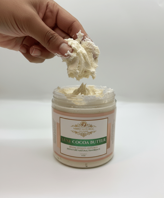 Wrap your skin in deep nourishment with our Simply Natu-Real Alchemy Luxe Cocoa Body Butter Moisturizer — a rich, velvety, herbal-infused formula designed to soften, hydrate, and enhance skin’s natural suppleness.